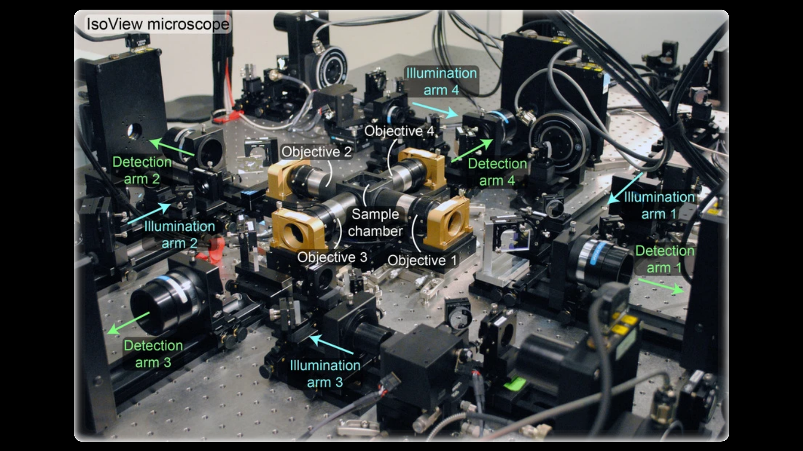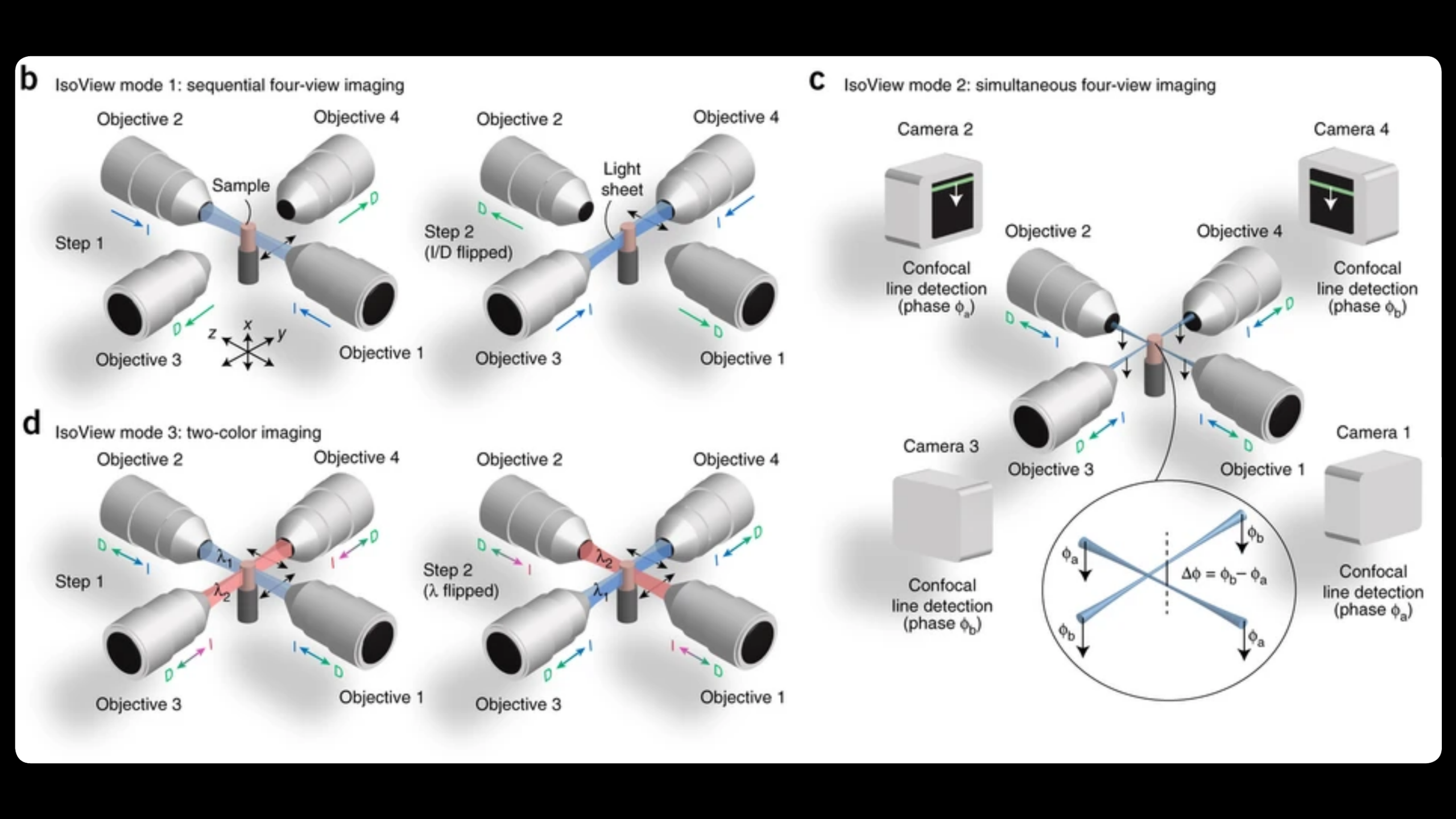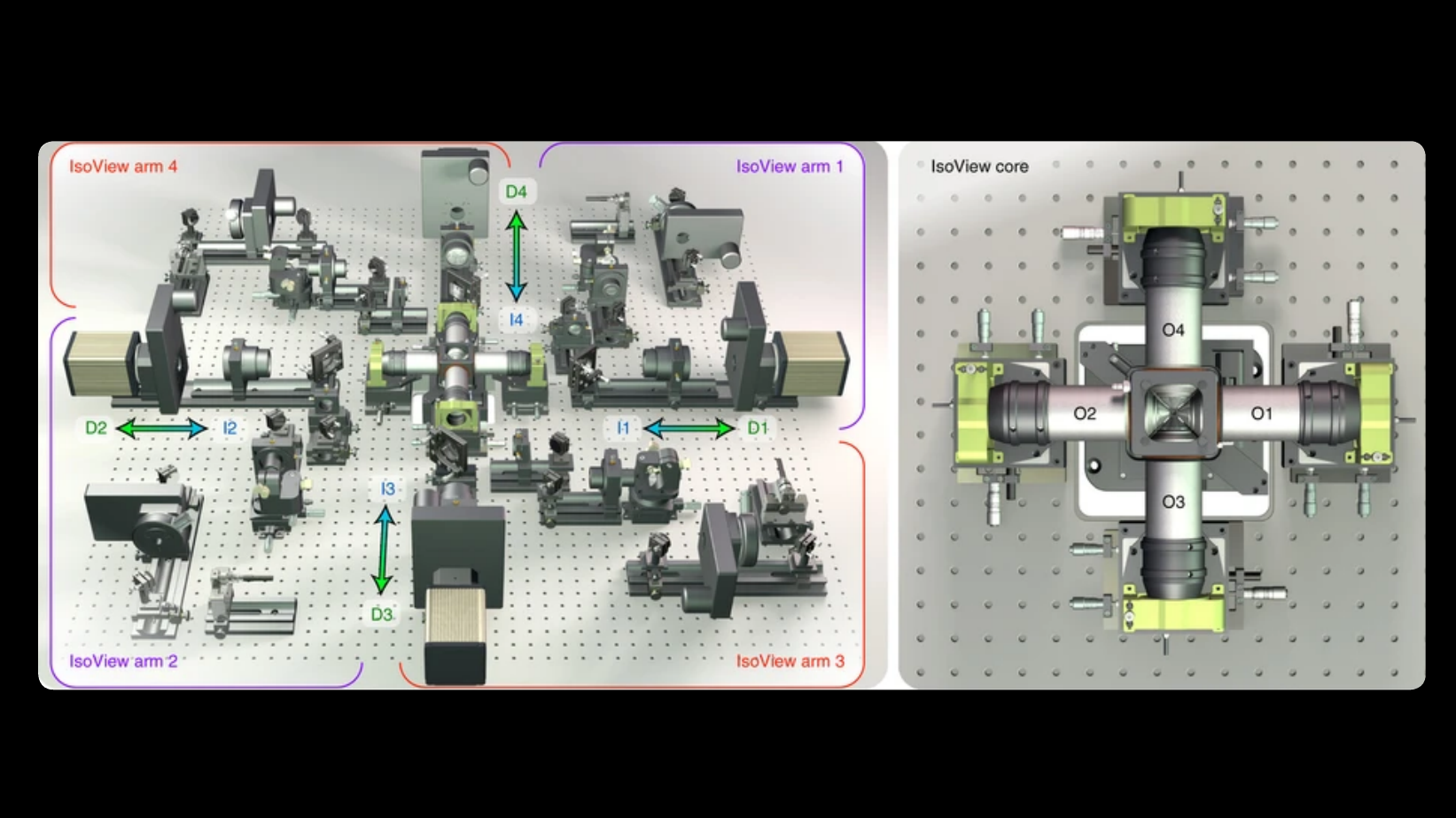 Imaging fast cellular dynamics across large specimens requires high resolution in all dimensions, high imaging speeds, good physical coverage and low photo-damage. IsoView (Isotropic multiview light-sheet microscopy), [1] originally developed at HHMI Janelia Research Campus, achieves these requirements by rapidly imaging large specimens via simultaneous light-sheet illumination and fluorescence detection along four orthogonal directions.